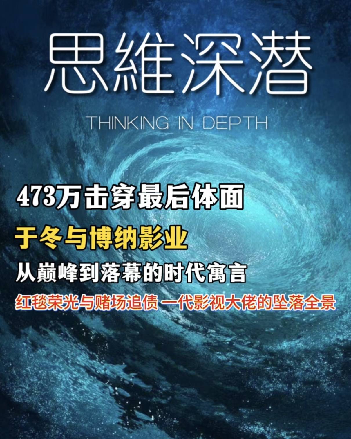思维深潜研究组认为,于冬的困局从来不是473万的小事,而是时代周期、内容战略、公司治理、资金杠杆四重共振的必然。他靠民营发行牌照崛起,靠港片渠道扩张,靠主旋律风口登顶,每一步都踩中时代红利;可当票房见顶、资本退潮、审美变迁,高杠杆、重资产、强依赖实控人的模式,瞬间变成致命枷锁。