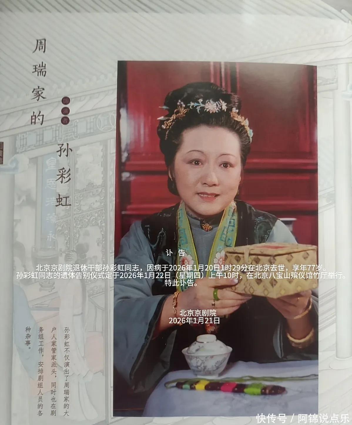 今年1月20日,孙彩虹因病离世,享年77岁。家人未透露具体病因,只说是在医院治疗期间走的。三天后,她的追思会在八宝山竹厅举行。虽然她一生低调,退休后鲜少露面,但为《红楼梦》所做的一切,早已融进这部经典的骨血里。 如今,又一位亲历者走了,留下的不只是角色,更是一代人对“认真”二字的理解。