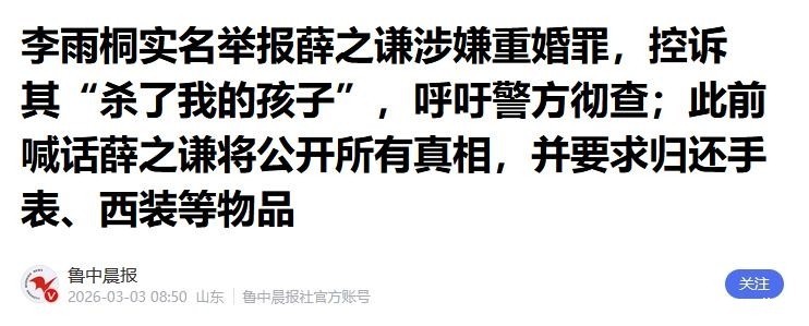 2026年3月2日,薛之谦昔日恋人李雨桐以真实姓名公开控诉,直指其存在重婚事实、策划“设局式”陷阱、长期实施精神施压——这场本属私人范畴的情感纠葛,不仅令薛之谦苦心维系十余年的公众形象骤然瓦解,更意外将毫无关联的张杰卷入汹涌舆情漩涡。