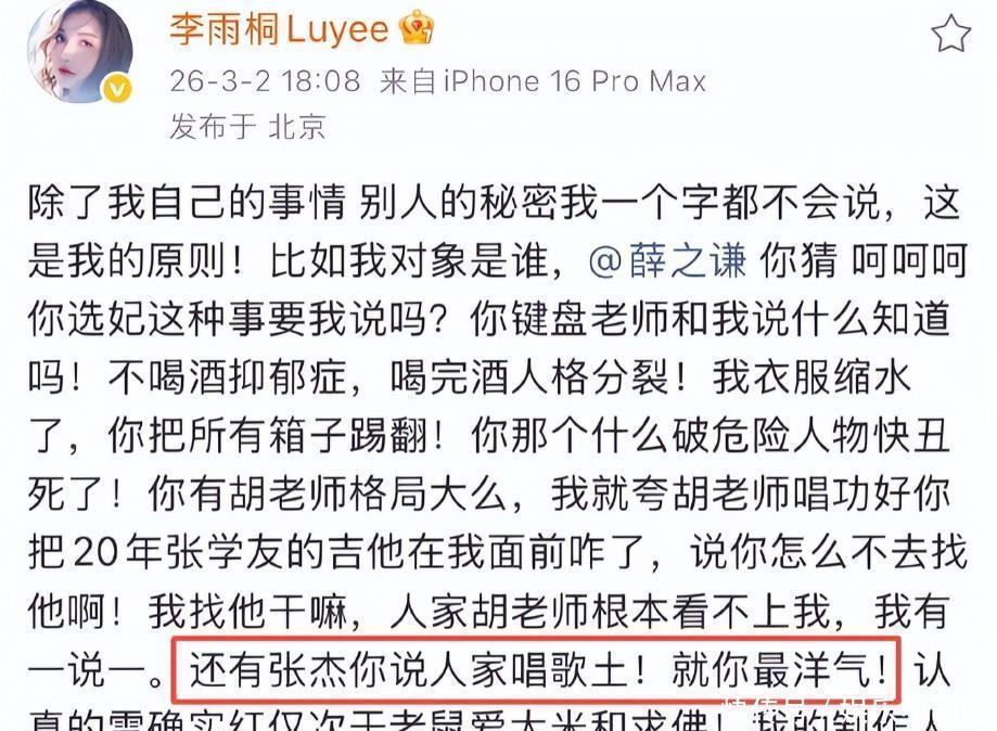 3月2日,李雨桐在网上向薛之谦喊话,还顺便提了一句,说他私底下批评张杰唱歌很土。
